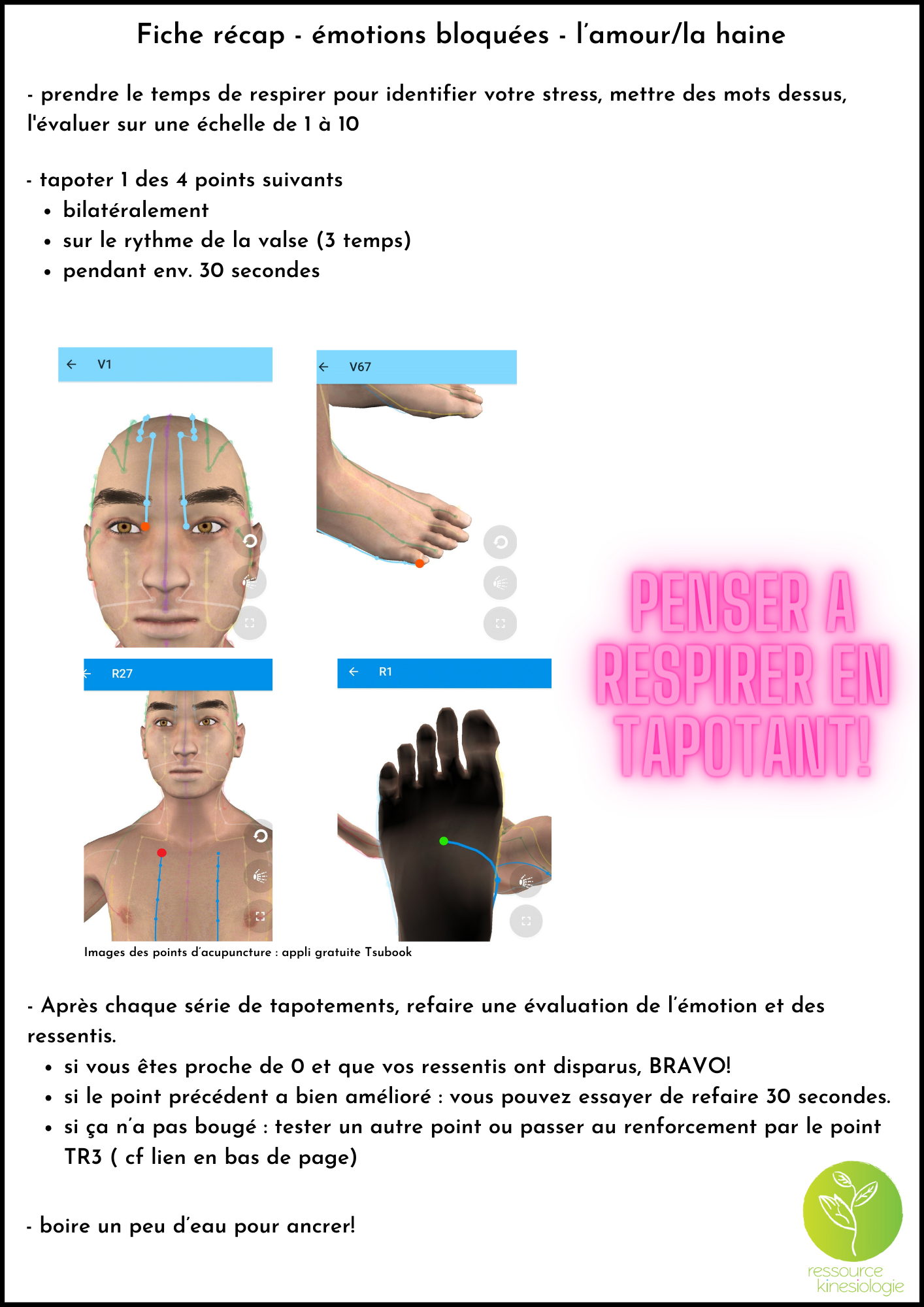 voici la fiche récap de la procédure et des points évoqués en séance pour vous aider à vous libérer de vos blocages dans l’amour ou la haine